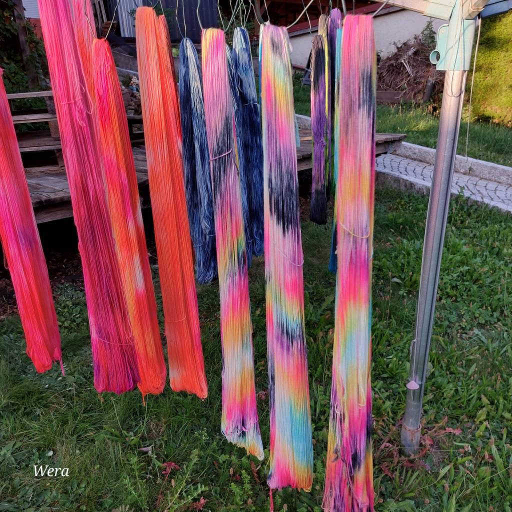 Am Ende stand sie da: eine prachtvolle Sortierung, die einfach Freude macht. Dieses Mal haben wir bewusst ganz anders gefärbt, sodass spannende Muster richtig schön zur Geltung kommen können. Kurz gesagt: Farben satt, Lachen satt – und ein Tag, der uns wieder gezeigt hat, das Färben ein kleines Abenteuer ist.