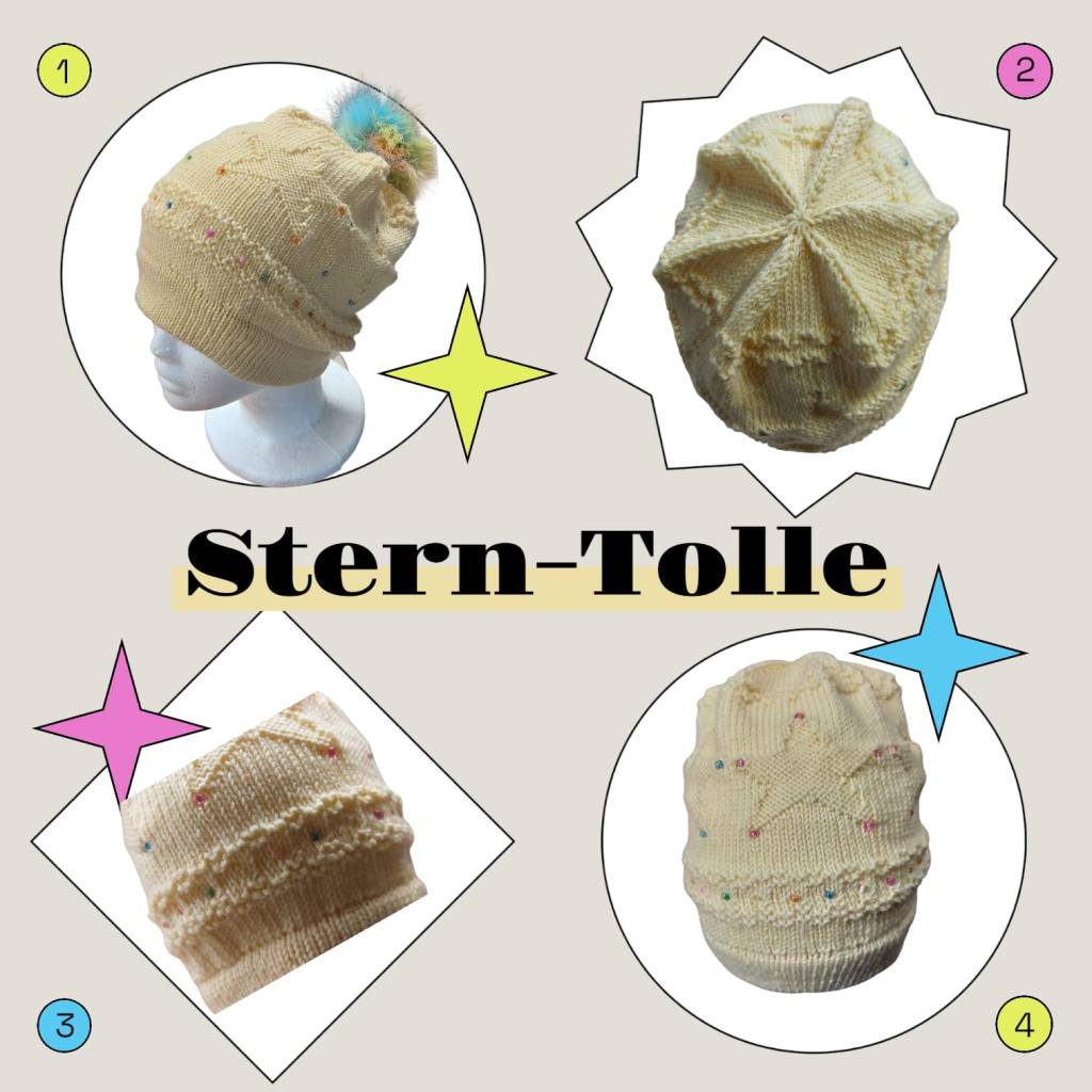 Rundstricknadel 3,75 Wolle : Timona Linie 110 , ProLana ( Resteverwertung ) 120 Ma Anschlag / doppeltes Bündchen 33 Runden 1 Runde rechts dabei 20 Maschen in der Runde aufnehmen. Schaft der Mütze: einfach Freestyle – glatt re mit unterschiedlichen Zwischenrunden gearbeitet mit linken Maschen. Abnahmen: bei erreichter Höhe je nach Größe nach jeder 10 rechten Masche einen Maschenmarkierer setzen dann die Abnahmerunden beginnen und in jeder Runde immer die beiden Maschen vor dem Maschenmarkierer zusammen rechts abstricken. So entsteht dieses nette Sternkarussell – wenn sich die Maschenmarkierer treffen dann ist die Abnahme beendet und die Mütze kann beendet werden wie gewohnt. Bei Lust und Laune kann die Mütze mit hübschen Knöpfen verziert werden.