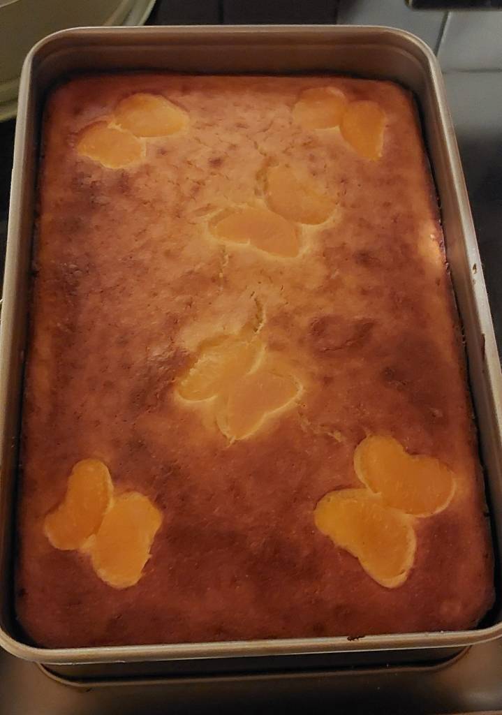Zutaten: 5-6 Eier 165g Zucker 1 Pck. Vanillezucker oder Vanillearoma 110g Weichweizengrieß 500g Magerquark 1Pck. Orangenzucker (oder Zitronenzucker) 1 DS Mandarinen Zubereitung: Eier und Zucker und Vanillezucker mindestens 8 – 10 Minuten sehr schaumig rühren mit der Küchenmaschine oder Handmixer. Grieß und Orangenzucker langsam einrieseln lassen. Quark nur mit dem Handbesen vorsichtig unterheben ( wenn der Quark noch zu fest ist dann kurz mit dem Handmixer und etwas Milch aufschlagen und dann erst unter die Grießmasse heben.). Die Hälfte des Teiges in eine schon gefettete Kastenform ( ca.25cm ) füllen – Mandarinen drauf verteilen und dabei aber bitte 6-8 schöne Schnitzle zur Seite legen damit machen wir Dekoschmetterlinge ) . Rest Teig obenauffüllen , glattstreichen und die restl. Mandarinen zu kleinen Schmetterlingen oben als Deko drauf legen. Ab in Ofen für ca. 45 Minuten je nach Backofen. Sich freuen und genießen. En guddddeeee 😋.