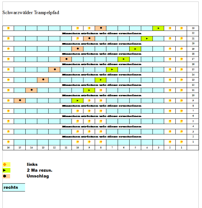 Wenn einen jetzt schon die Farbe nicht umhaut dann wenigstens angenehmes stricken und ja nicht als Stino weil sonst fällt irgendwann die Nadel aus der Hand vor Langeweile 😅 – hab im Netz irgendwo mal das Muster notiert – es hat aber keinen Namen. Somit geb ich dem Muster den Namen Schwarzwald-Klinker und so gehts: